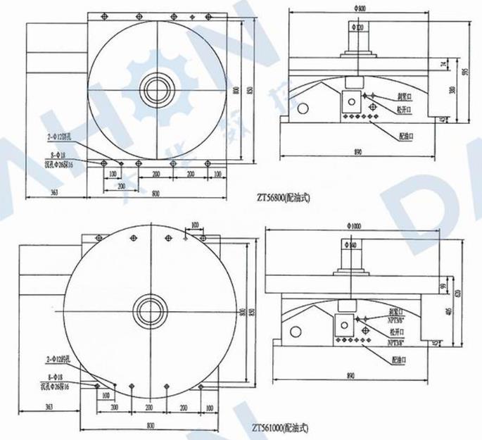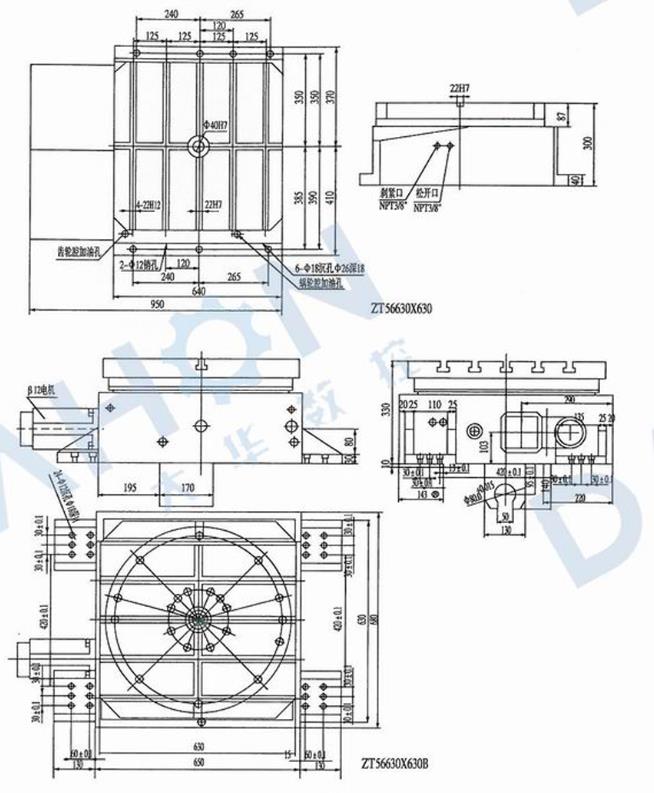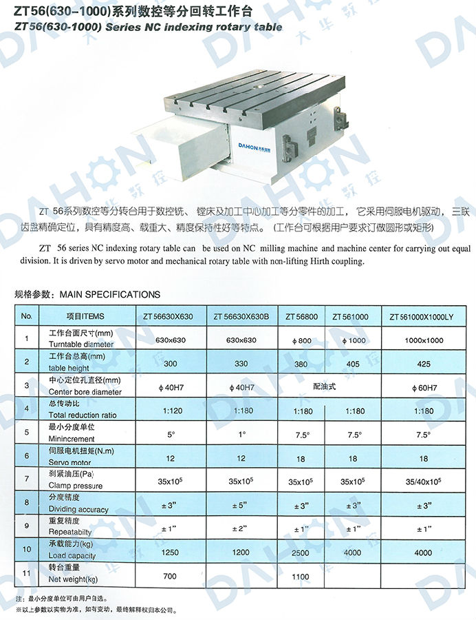 ZT56(630-1000)系列數(shù)控等分回轉工作臺用于數(shù)控銑、鏜床及加工中心加工等分零件的加工,它采用伺服電機驅動,三聯(lián)齒盤精確定位,具有精度高、載重大、精度保持性好等特點。(工作臺可根據(jù)用戶要求訂做圓形或矩形)