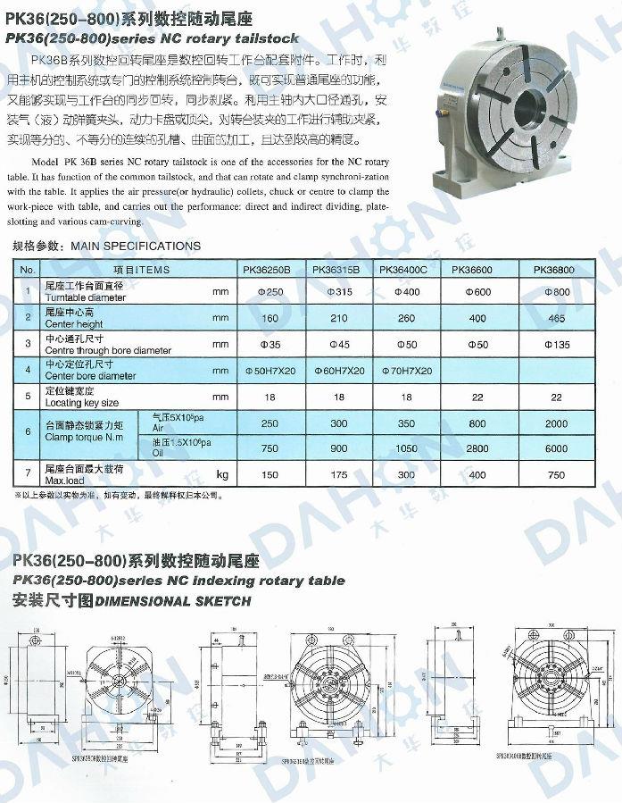 PK36B系列數(shù)控隨動尾座是數(shù)控回轉(zhuǎn)工作臺配套附件。工作時 ,利用主機的控制系統(tǒng)或?qū)iT的控制系統(tǒng)控制轉(zhuǎn)臺,既可實現(xiàn)普通尾座的功能,又能夠?qū)崿F(xiàn)與工作臺的同步回轉(zhuǎn),同步剎緊。利用主軸內(nèi)大口孔徑通孔,安裝氣(液)動彈簧夾頭,動力卡盤或頂尖,對轉(zhuǎn)臺裝夾的工件進行輔助夾緊,實現(xiàn)等分的、不等分的連續(xù)的孔槽、曲面的加工,且達到較高的精度。