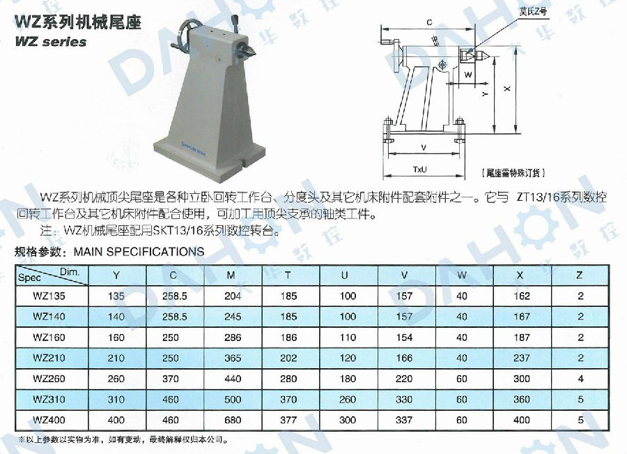 WZ系列機械頂尖尾座是各種立臥回轉(zhuǎn)工作臺、分度頭及其它機床附件配套附件之一。它與SKT13/16系列數(shù)控回轉(zhuǎn)工作臺及其它機床附件配合使用,可加工用頂尖支承的軸類工件。WZ機械尾座配用SKT13/16系列數(shù)控轉(zhuǎn)臺。